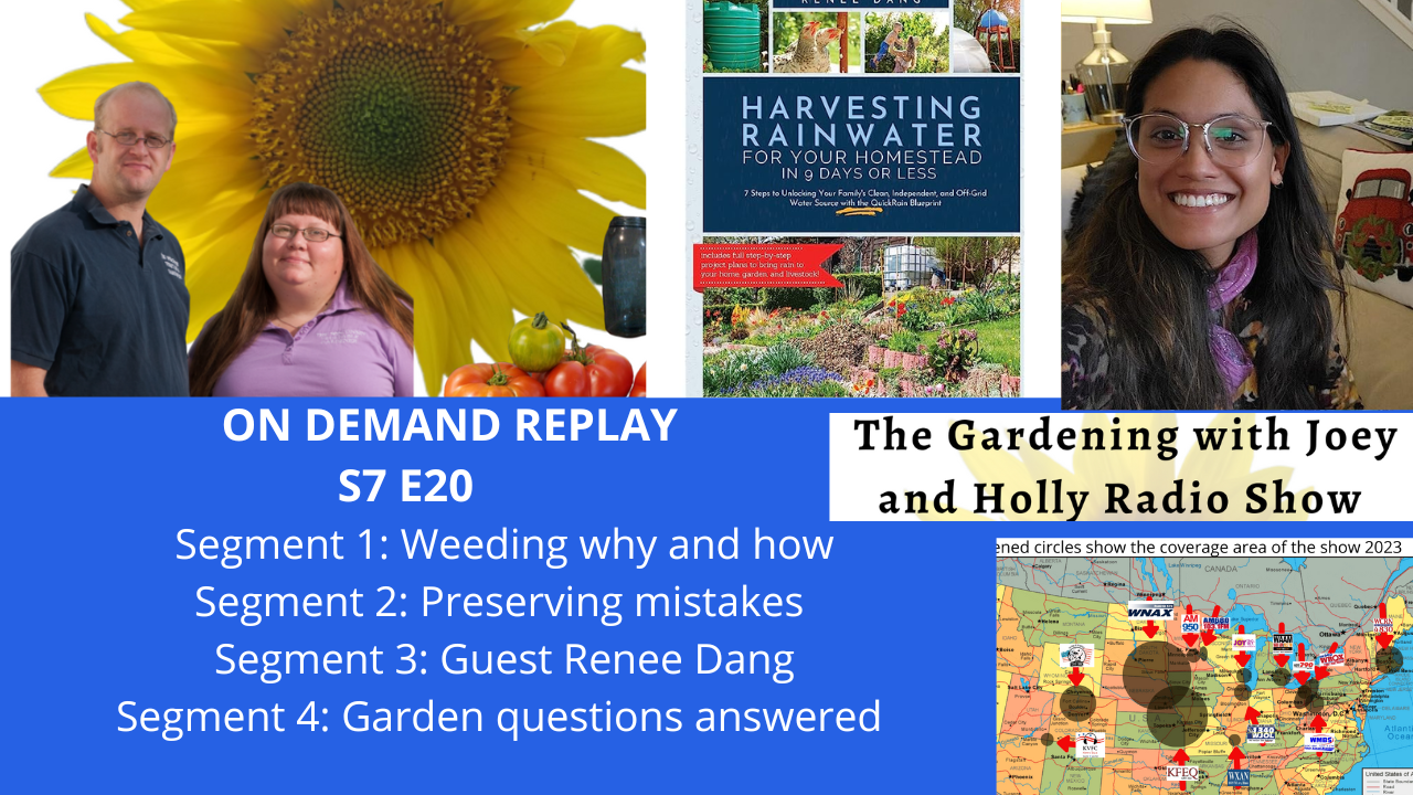 Season 7 episode 20 of 2023. Joey and Holly will talk about weeding the garden, why and the best way to do it. In segment 2 Joey and Holly will go over several Preserving mistakes. In segment 3 they welcome their guest Renee Dang to learn more about Renee click here .In segment four, Joey and Holly will be answering garden questions.