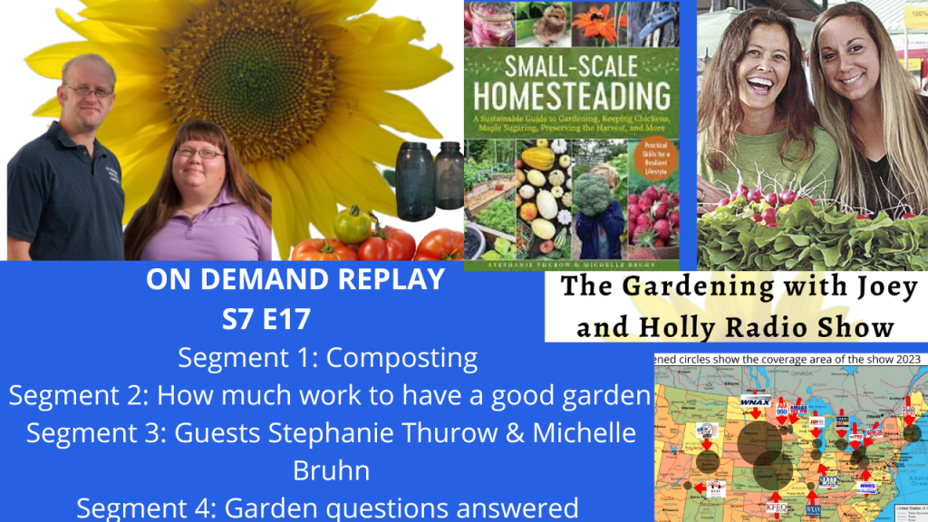 Season 7 episode 17 of 2023. Joey and Holly will talk about the ways of composting in segment 1. In segment 2 Joey and Holly will look at how much work is needed to grow a garden. In segment 3 they welcome their guests authors Michelle Bruhn