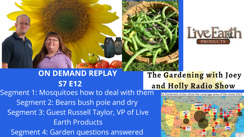 S7E12 dealing with Mosquitoes ,pole, bush and dry beans, Guest Live Earth Products -The Gardening with Joey and Holly radio show
